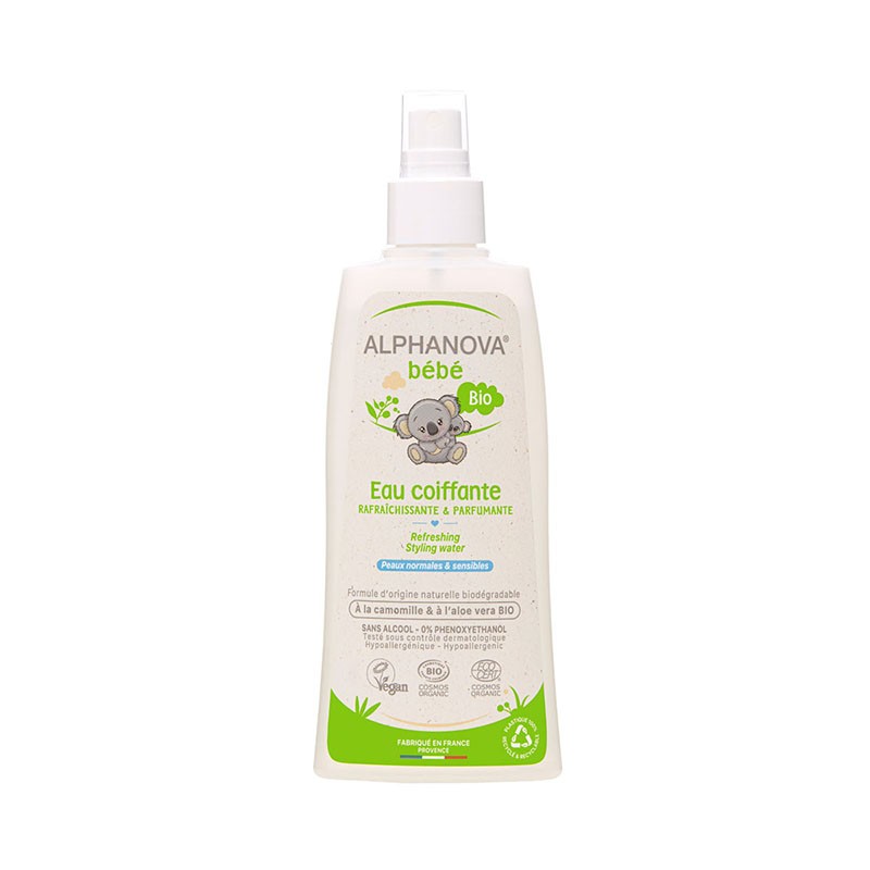 Agua de Peinado Refrescante Bebe BIO Alphanova, 200 ml. Fórmula innovadora con Alphaprotect®, un activo natural patentado, que estimula la protección natural de la piel de bebé. Producto desarrollado para minimizar los riesgos de alergia. Sin parabenos, phenoxyethanol, triclosan, ni formaldehido.