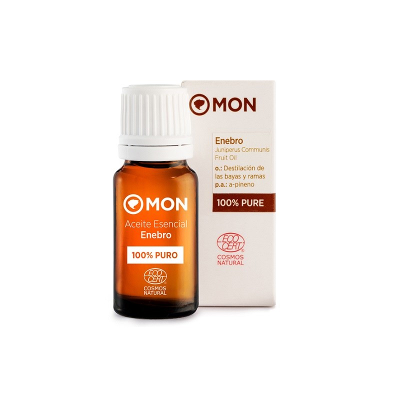 Aceite Esencial Enebro Eco Mon. Útil en las terapias contra el dolor y en los tratamientos adelgazantes, gracias a su potente acción diurética y depurativa. Es un aceite esencial con un ligero efecto rubefaciente, que aumenta la temperatura y, es analgésico.