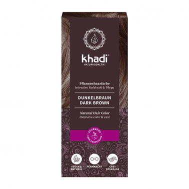 Tinte herbal color castaño oscuro Khadí. Tinte ecológico con plantas que proporcionan un tono castaño oscuro. Formulación ayurveda de larga permanencia para un pelo con brillo, volumen y suavidad.