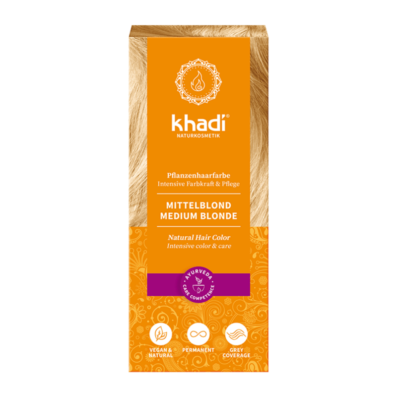 Tinte herbal color rubio medio Khadí. Tinte ecológico con plantas que proporcionan un tono rubio medio. Formulación ayurveda de larga permanencia para un pelo con brillo, volumen y suavidad.