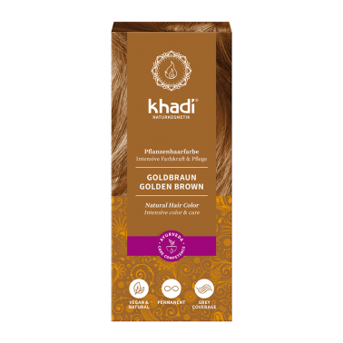 Tinte herbal color castaño dorado Khadí. Tinte ecológico con plantas que proporcionan un tono castaño dorado. Formulación ayurveda de larga permanencia para un pelo con brillo, volumen y suavidad.
