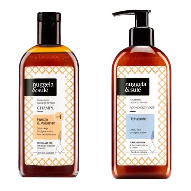 Pack Acondicionador + Champú con extracto de cebolla 250 gr. + 250 gr. Nuggela & Sulé tratamiento capilar en formato Champú Premium y Acondiconador Premium, que estimula en cada lavado el crecimiento del cabello. Se trata de un producto de última generación potenciado con Extracto de Cebolla Roja, Glucógeno Marino y Sales del Mar Muerto, recuperando así una tradición eficaz que ya usaban desde los médicos en la edad media o los antiguos egipcios hasta muchas de nuestras abuelas para tener un cabello largo, hermoso y sano.