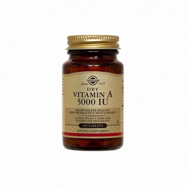 Vitamina A seca 5000 ui palmitato Solgar. Repara los tejidos del organismo, cuida el sistema óseo, el cabello, las uñas y los dientes y fortalece el sistema inmunitario.