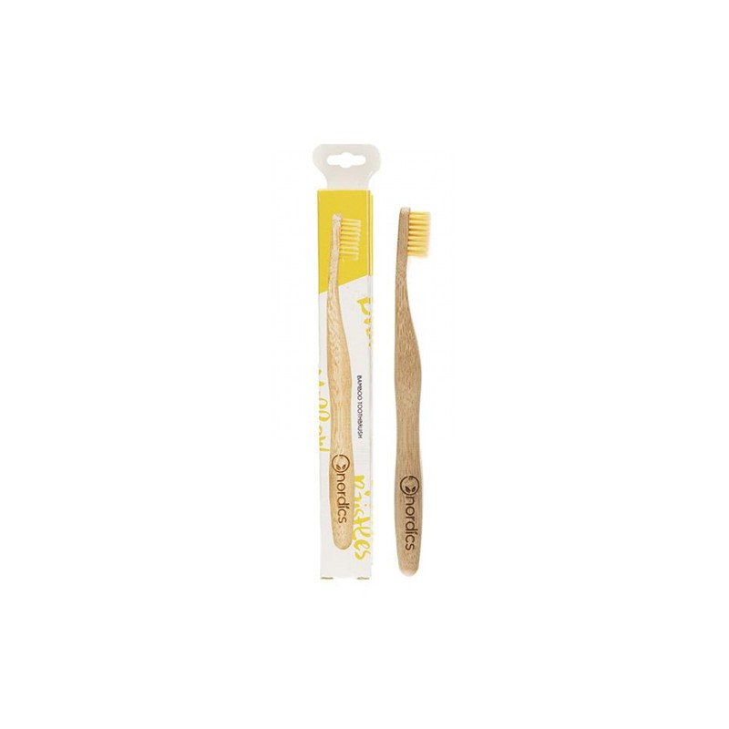 Cepillo dental Bambú Amarillo Nordics. Cepillo dental con mango 100% de bambú moso, biodegradable. Con cerdas de nylon reciclado que limpian delicadamente los espacios interdentales sin dañar el esmalte. Presentado en un estuche de papel reciclado.