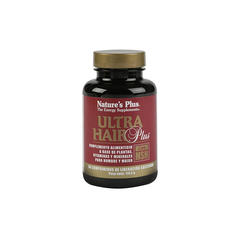 Ultra Hair Plus (Cheveux Cabello) Natures Plus. Fórmula nutricional para el cuidado del cabello, rica en compuestos azufrados (MSM, L-cisteína, L-metionina, L-glutation) y sustancias que dan soporte a la síntesis de queratina. Con nutrientes específicos como la biotina y el zinc que contribuyen al mantenimiento del cabello en condiciones normales.