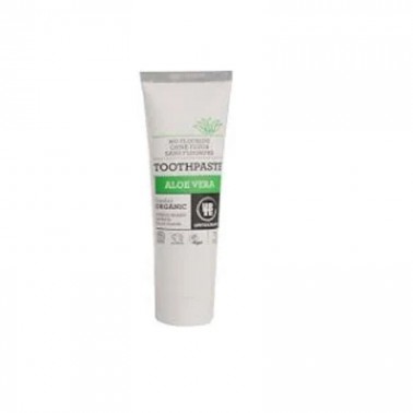 Dentifrico Aloe Vera Urtekram. Sin flúor. Eficaz en los diferentes aspectos del cepillado. La creta que contiene se recupera del fondo marino y se pulveriza. Es la razón del color natural de la pasta. Con el sabor fresco de la mandarina y una dosis extra de aloe vera que ayuda a proteger las encías y proporciona un cuidado adicional. El toque final es la mirra que tiene un efecto desinfectante. COSMOS ORGANIC certificado por Ecocert Greenlife. Vegano. No testado con animales.