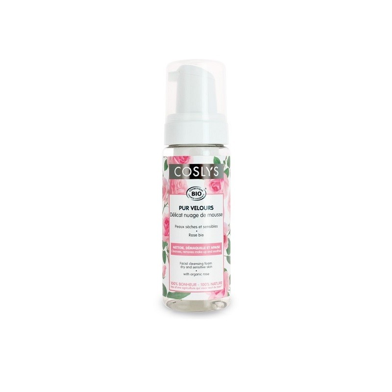 Espuma limpiadora todo tipo de piel Coslys.  Limpia, desmaquilla y purifica la piel sin resecarla gracias a sus extractos biológico de aloe vera y extracto de rosas damascena.