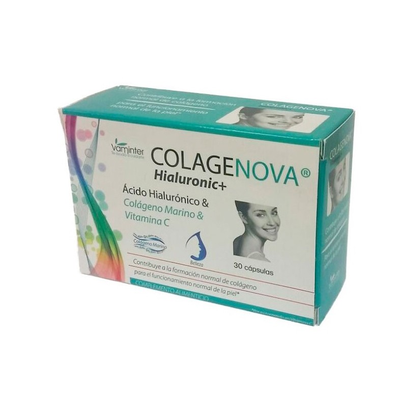 Colagenova Hialuronic+ Vaminter. Complemento alimenticio a base de ácido hialurónico, colágeno hidrolizado marino y vitamina C. Contribuye a la belleza de la piel con efecto relleno.