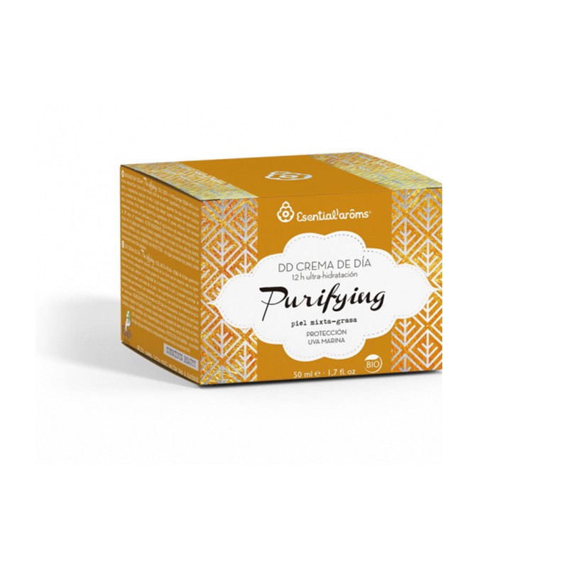 Crema DD Purifying Piel Mixta-Grasa Esential Aroms, 50 ml. Crema de última generación formulada con emulsionante natural extraído de la oliva, insaponificables del aceite de oliva, aceite de tsubaki o camelia japónica, betaína de acción antimanchas y protección natural Uva-marina, procedente de algas rojas. Aporta 12 horas de ultrahidratación. Indicado para piel mixta-grasa.