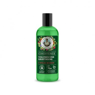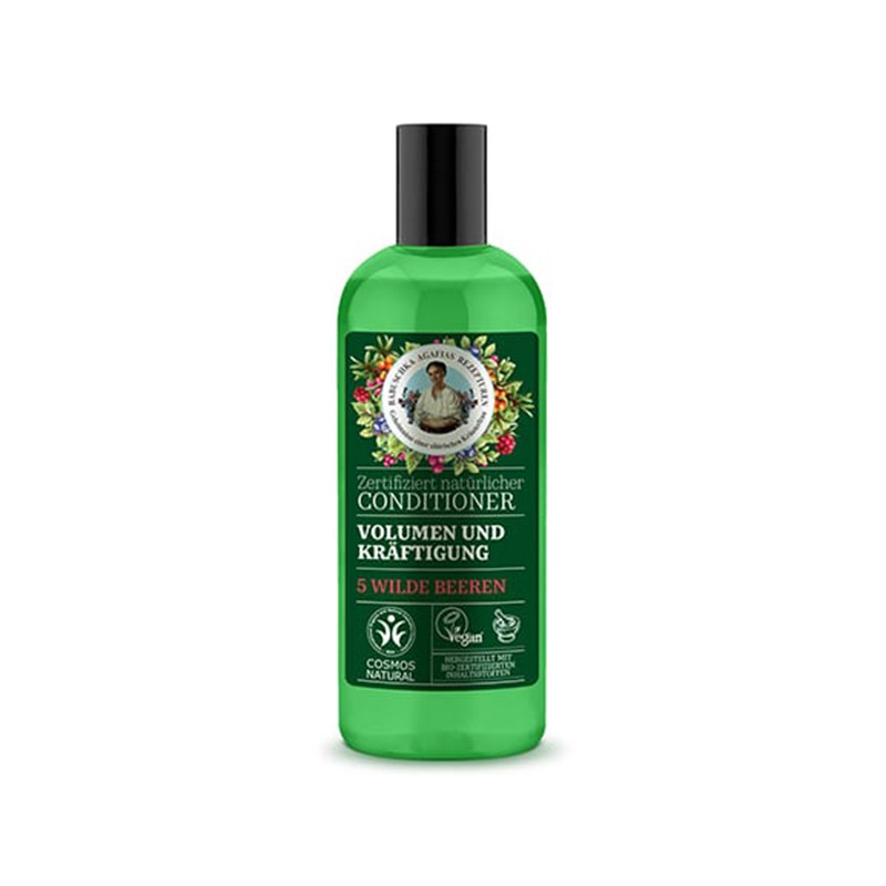 Acondicionador Voluminizador y Fortalecedor Green Agafia, 260 ml. Las 5 bayas silvestres (extractos de espino amarillo de Altái, frambuesa nórdica, arándanos y enebro) contienen varias vitaminas que crean la combinación perfecta para cuidar del cabello y dejarlo fuerte y voluminoso. Sin parabenos.