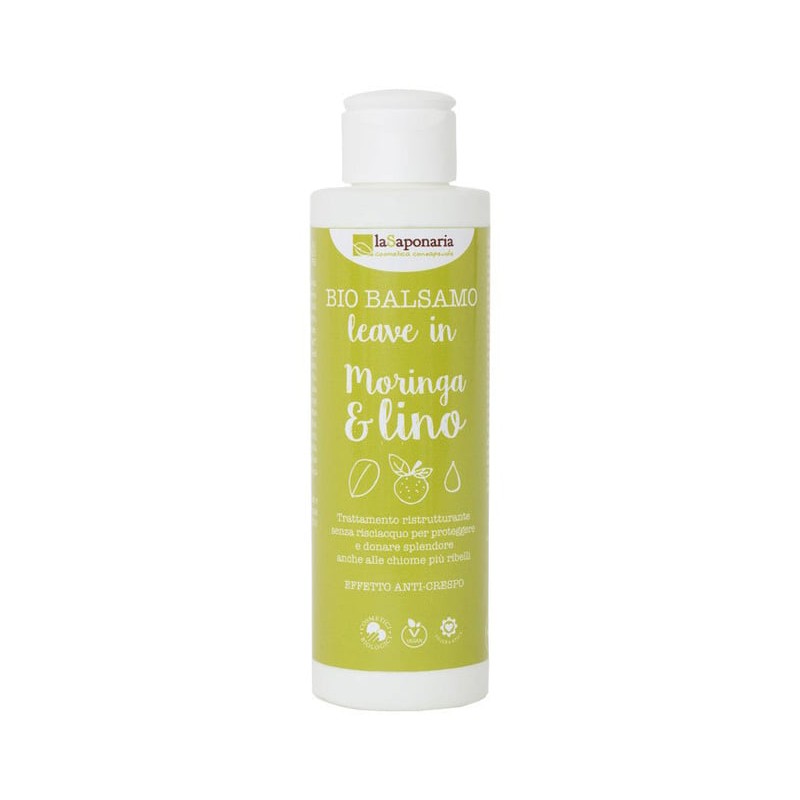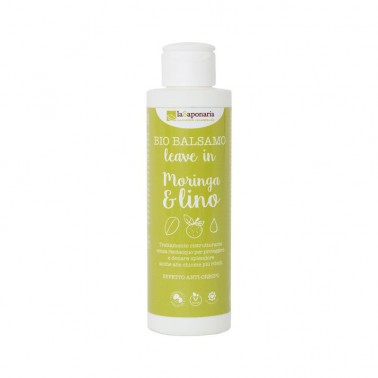 Acondicionador Moringa y Linaza Sin Aclarar La Saponaria, 150 ml. Tratamiento reestructurante sin aclarado para proteger y dar brillo incluso a los cabellos más rebeldes. La manteca de karité, el extracto de moringa (también llamada planta milagrosa) y las semillas de lino tienen un efecto nutritivo y reestructurante, mientras que los oligosacáridos de la fruta forman una película protectora y antiestrés que aporta al cabello suavidad, vitalidad y brillo.