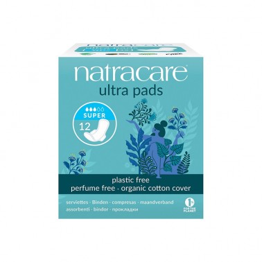 Compresa Super con Alas Natracare, 12 uds. Compresas para la menstruación finas, absorbentes, adecuadas para flujo menstrual medio a abundante. No contienen materiales plásticos, cloro, rayón, látex, aditivos químicos, fragancias ni tintes.