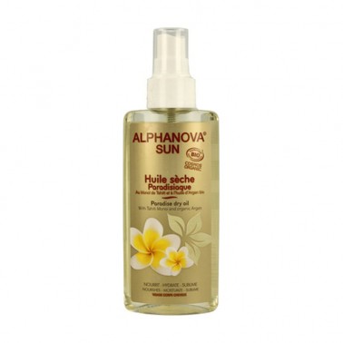 Aceite Seco Paradise BIO Alphanova, 125 ml. Fórmula natural certificada ecológica, que permite nutrir y sublimar la piel y el cabello. Su textura no grasa aporta un acabado satinado a la piel, al tiempo que la hidrata después de la exposición al sol.