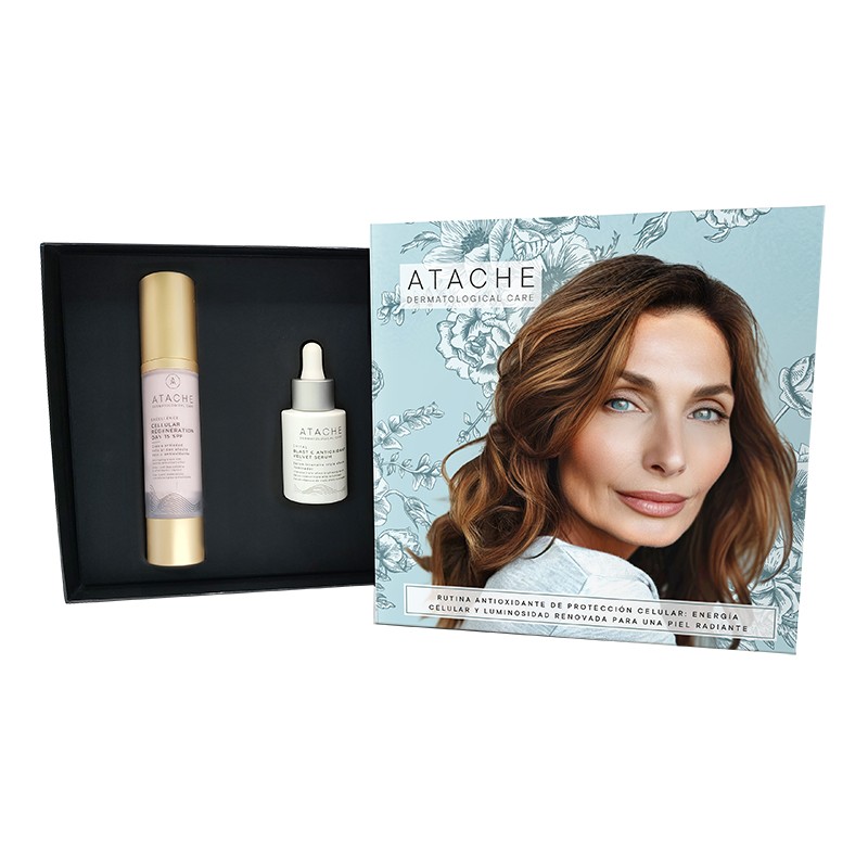 Atache aplica al diseño de sus productos antiedad un enfoque preventivo global, con el objetivo de anticiparse y/o reparar los signos del envejecimiento. La combinación de su triple efecto iluminador y del Pro Blast System proporciona una piel iluminada y aterciopelada.