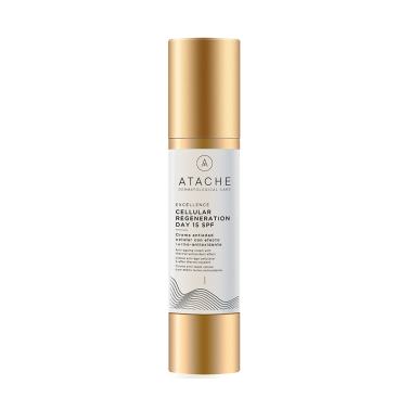 Excellence Cellular Regeneration Day SPF15 Atache, 50 ml. Crema de día que incorpora en su fórmula dos eficaces activos que ayudan a prolongar la juventud de la piel: El innovador TeloActive, que mantiene el buen estado el funcionamiento de los fibroblastos y retrasa los signos de la senescencia celular mediante la activación de la telomerasa, y el potente activo Celular Shield que protege el ADN, mantiene en buen estado el metabolismo de la piel y actúa como escudo ante el daño que sufren las células durante el proceso de envejecimiento.