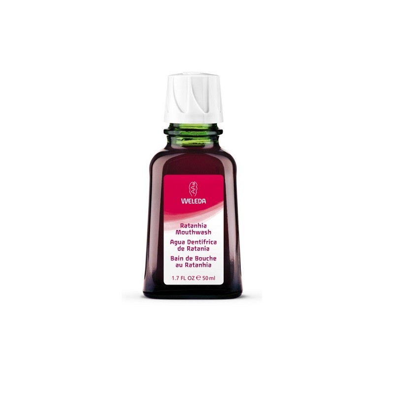 Weleda Agua dentrífica de Ratania. El enjuague bucal concentrado respeta la flora natural de la boca, activando las propiedades antisépticas y astringentes de la mirra y la ratania, para tonificar y fortalecer las encías y prevenir irritaciones. Su alto contenido en aceites esenciales de salvia, eucalipto y menta refresca además el aliento de forma duradera.